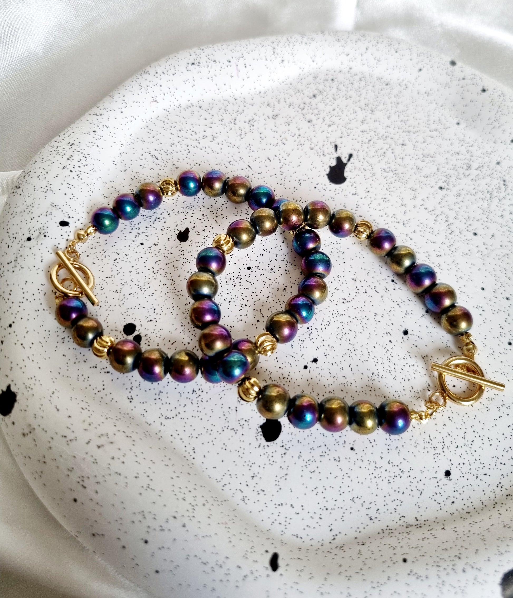 The Aurora Harmony Bracelet combines the regal richness of gold, the calm depth of blue, and the mystical allure of purple in a stunning blend of metal beads. Featuring an 18ct gold plated toggle clasp, this bracelet exudes a balance of elegance and strength. Inspired by the harmonious connection between the earth and sky, this design serves as a reminder to embrace your inner power and find beauty in balance.