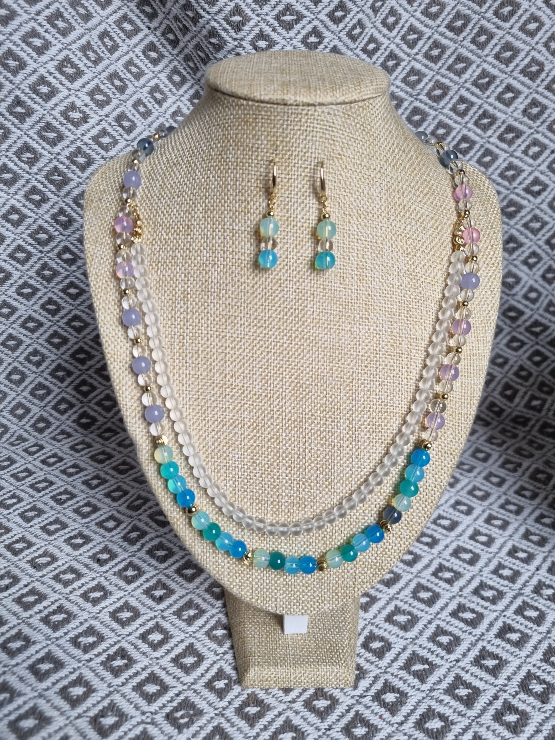 The Morning Bliss Necklace Set captures the soft, radiant hues of a sunrise, blending light blue, transparent blue, white, and delicate pink glass beads. Accented with 18ct gold plated spacers, this elegant double-layer design reflects the beauty of new beginnings and quiet moments of peace. Perfect for adding a touch of serenity and sophistication to any outfit, this necklace symbolizes hope, renewal, and gentle confidence.